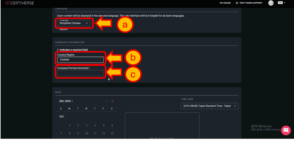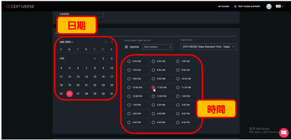 d.選定考試日期。先選日期,再選時間,請再次確認TIME ZONE欄位為(UTC+8:00) Taipei Standard Time – Taipei