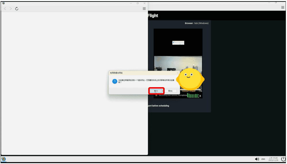 14.出現退出網址提示,請點選「是」。可能是畫面測試完畢,而不是正式考試的緣故吧,