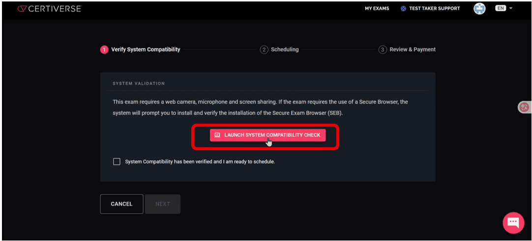為了確認報考者的電腦是否能進行線上監考考試,所以要求先做一次系統相容性檢查。(請點擊紅色按鈕 「LAUNCH SYSTEM COMPATIBILITY CHECK」)
