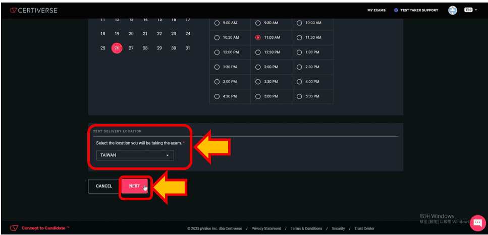 e.確認考試地點是否為「TAIWAN」,再點選「NEXT」