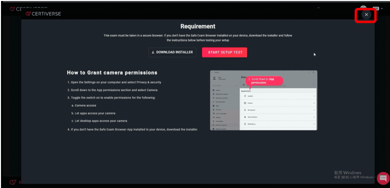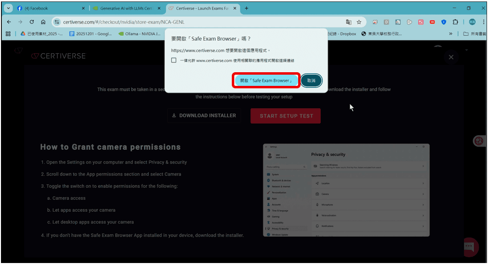 線上監考系統測試,需重新登入,請參考步驟1~5。當按下紅色按鈕 「LAUNCH SYSTEM COMPATIBILITY CHECK」時,瀏覽器會跳出是否開啟「Safe Exam Browser」的提示,請按下開啟「Safe Exam Browser」按鈕。
